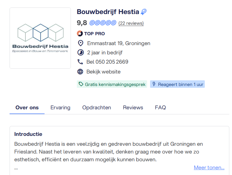 Je maakt een bedrijfsprofiel aan met adresgegevens, openingstijden en een link naar je homepage. Dit helpt vooral bij lokale SEO en laat Google zien dat je bedrijf echt bestaat.